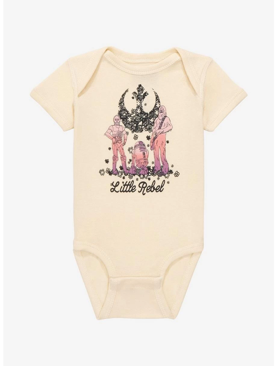 Your little Padawanâs ready to join the Rebellion with this adorable infant one-piece from Our Universe! Seen amongst the flowers standing in front of a floral take on the Rebellion insignia, C-3PO, R2-D2, and Chewbacca decorate the front of this comfy Star Wars style. With âLittle Rebelâ lettering along the bottom, your bundle of joy can nap or adventure in out-of-this-world style.Â