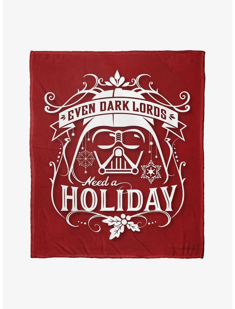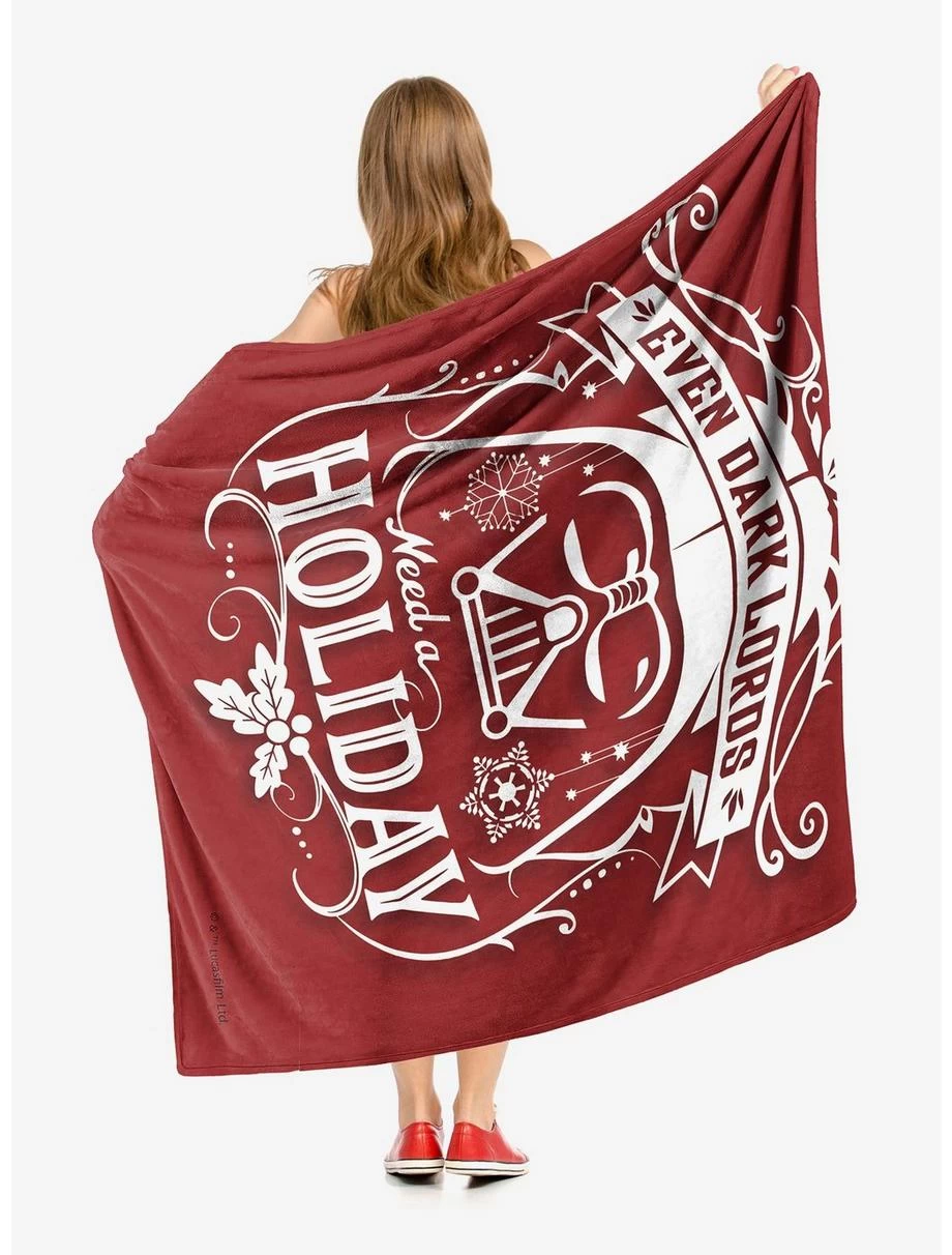 Silky soft and cozy, this Star Wars “Holiday Lord” Silk Touch Throw Blanket by The Northwest is ideal for snuggling. Grab our high-quality printed throw, it’s the perfect home accessory. Features an outline of Darth Vader and “Even dark lords need a holiday” on a red background. Silky-soft, warm and cozy throw; make great gifts for friends and loved ones. Measures 50″W x 60″L. Made of 100% Polyester. Machine wash cold separately using delicate cycle and mild detergent. Do not bleach. Machine dry separately on gentle cycle. Remove promptly. Do not iron.