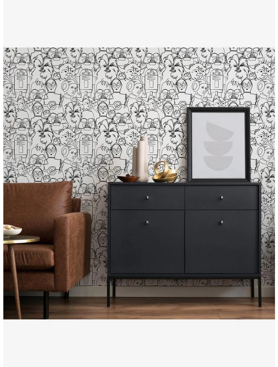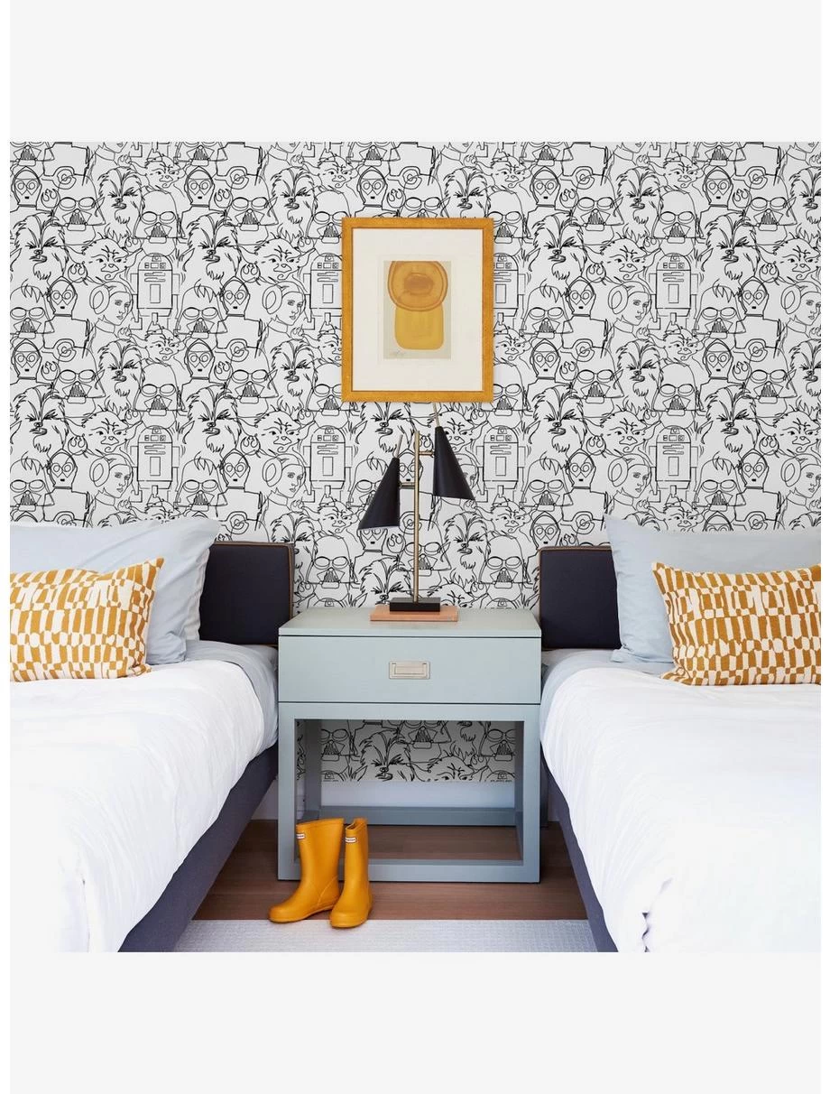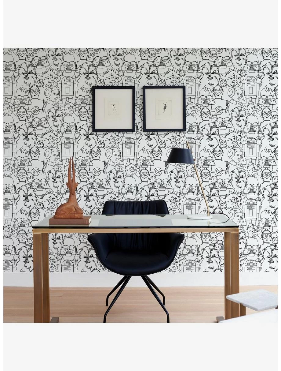 The Force is extremely strong with this Peel and Stick Wallpaper from RoomMates. Officially-licensed by Disney, this Star Wars design features iconic characters Princess Leia, Master Yoda, Darth Vader, Chewbacca, R2D2 and C3PO in a line-drawing illustration. No Jedi powers required for installation, just peel, stick, done! This print comes in 2 colorways: black ink on white peel and stick paper, and metallic silver ink on black peel and stick paper.