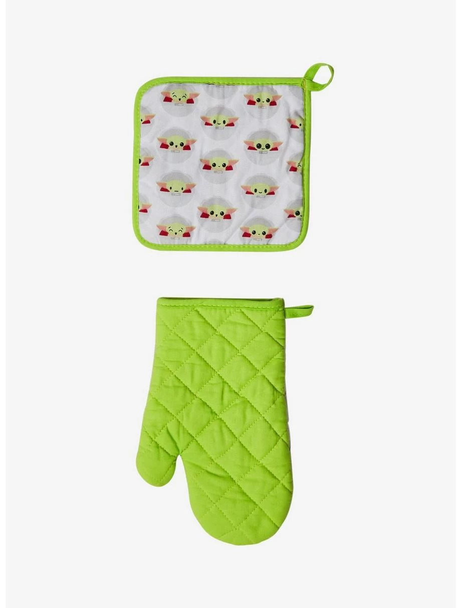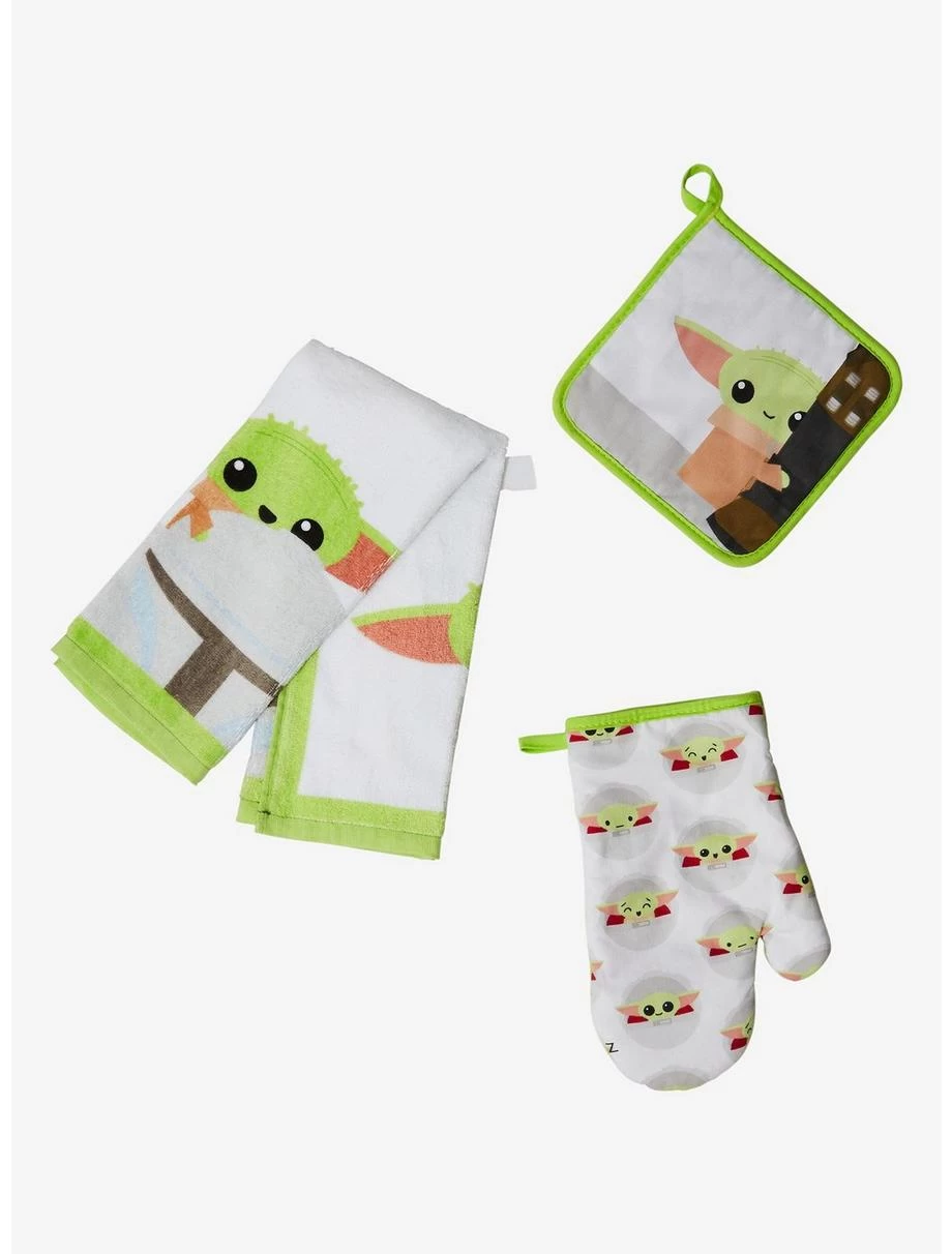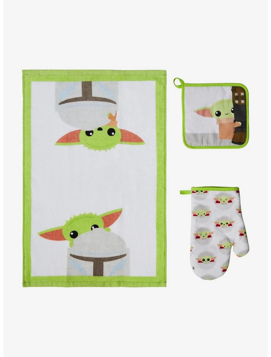 Cook up some delicious intergalactic meals (maybe some blue macarons?) with a bit of help from Grogu, the Child (AKA “Baby Yoda”) from The Mandalorian! Featured on Mando’s head, in his pram, and peeking out on the towel, oven mitt, and pot handle’s designs, you can bring your kitchenware to out-of-this-world levels of cuteness with this 3-piece kitchen set.